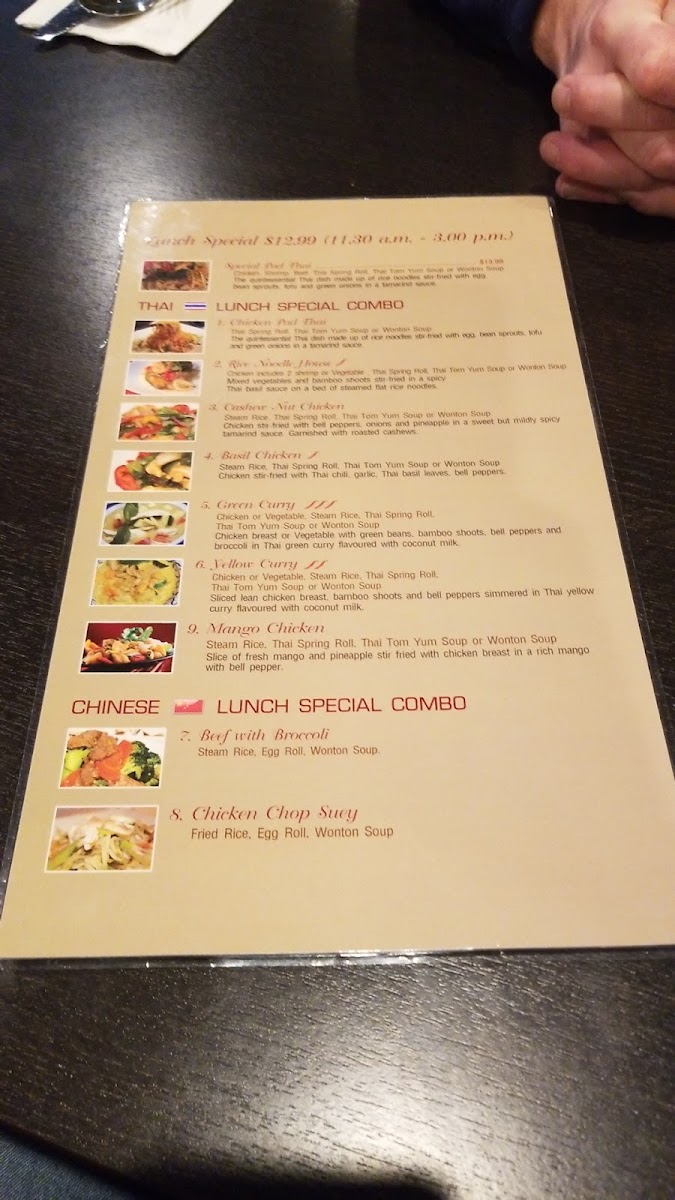 Includes 1 spring roll/steam rice. Your choice of wonton or Tom Yup Soup