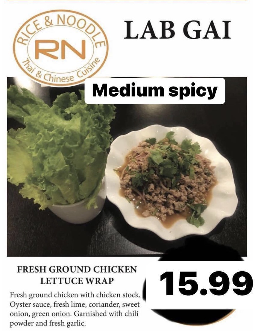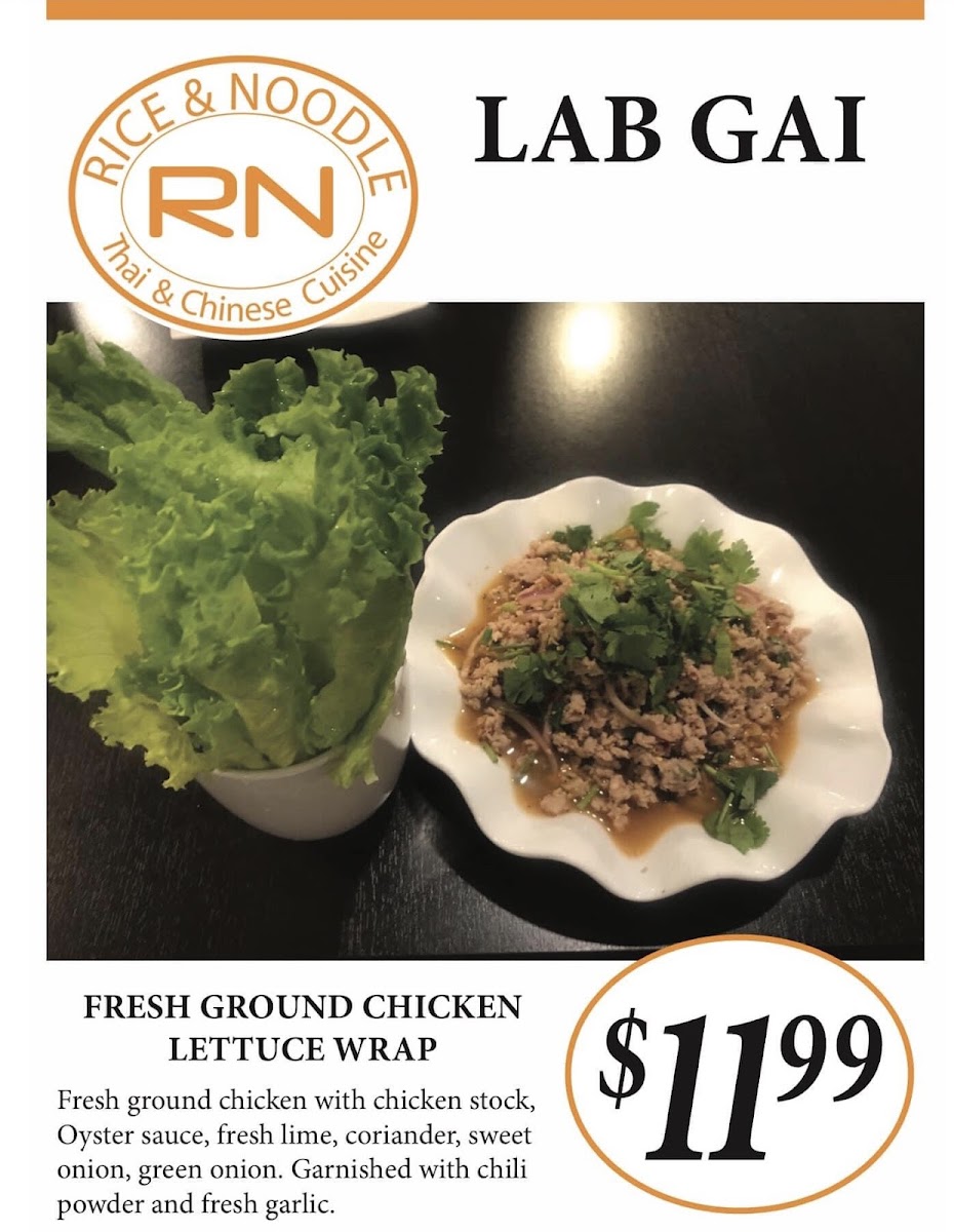 The menu at Rice & Noodle offers a diverse selection of flavorful dishes that cater to various tastes. For lunch, the Special Pad Thai Combo (medium spicy) is a standout, featuring chicken, beef, and shrimp along with a side of rice noodle house chicken or vegetables. Appetizers include options like Coconut Sticky Rice with Mango, Spring Rolls (vegetarian or chicken, 6.99-7.99), and Thai Dumplings. For salads, diners can enjoy Lab Gai (medium spicy), Mango Salad, and Shrimp Salad, with each providing a fresh, vibrant start to the meal. Soups like Pho Soup (large), Thai Tom Yum (small), and Coconut Soup (small, 6.99; large, 12.99) are available for those craving something warm and comforting. In the stir-fry section, the Mango Chicken and Cashew Chicken are popular choices, while the Spicy Basil Chicken or Beef and Ginger Chicken or Beef offer bold flavors. Rice dishes such as Chicken Fried Rice (17.99-22.99) and Thai Fried Rice (17.99-25.99) come in a variety of proteins, from vegetarian to seafood. For noodle lovers, the Pad Thai and Rice Noodle House are solid options, available with vegetarian, chicken, shrimp, or seafood (17.99-25.99). Vegetarian dishes include choices like Spicy Eggplant and Yellow Curry Vegetable. The restaurant also serves a range of Chinese Dinner Combos and Thai Dinner Combos, offering variety for larger groups. Extras like Sweet and Sour Sauce (2.00) and Peanut Sauce (2.00) can be added to enhance any dish. Gluten-free options are also available, including Pad Thai and Cold Rolls. Overall, Rice & Noodle provides a flavorful mix of Thai and Chinese cuisine, perfect for those looking for a satisfying and varied dining experience.